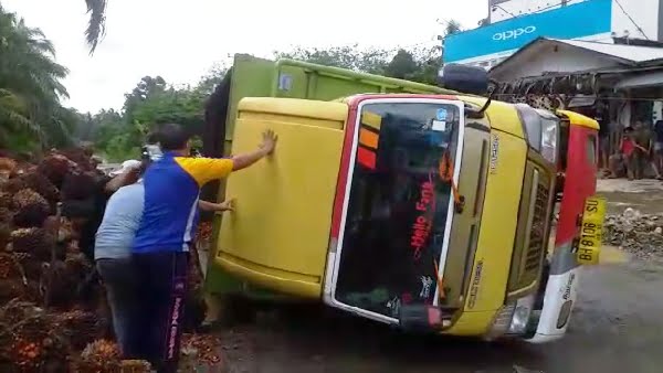Dengan kondisinya memprihatinkan jalan tersebut banyak yang berlobang dan rusak parah.Akibatnya pada hari sabtu siang (27/3/2021) satu unit truk dengan nopol BH 8106 SU yang membawa buah sawit terbalik di jalan tersebut.