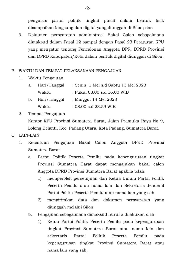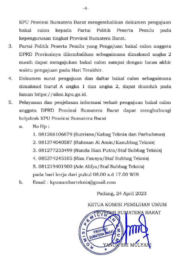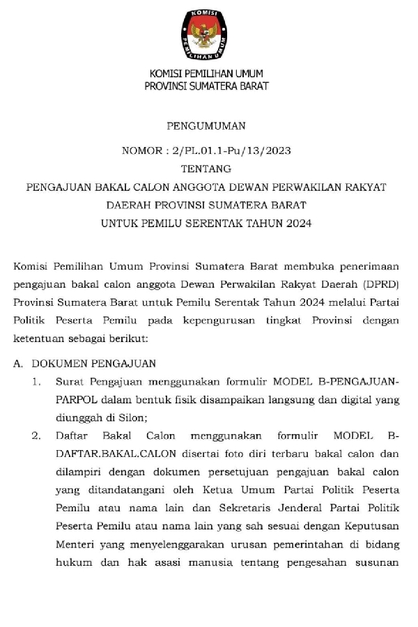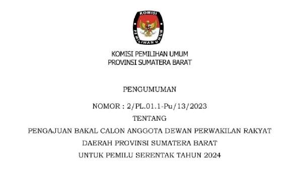 Pengumuman KPU Sumbar Tentang Pengajuan Bakal Calon Anggota DPRD Sumbar untuk Pemilu 2024 24 April 2023oleh Saribulih Saribulih 32,714 Baca juga : Dua Kasus Positif Covid-19 di Kota Pariaman Posting TerkaitKetua DPRD Sumbar Muhidi Apresiasi Petugas Jaga Kondusivitas NataruUang Harus Berputar di Daerah: Lima Prioritas Pemulihan Bencana SumbarKetua DPRD Sumbar Berharap Bantuan Bencana Tak Menumpuk, Dorong Koordinasi Aktif Lintas PemerintahanWakil Ketua DPRD Sumbar Evi Yandri Minta Satpol PP Sumbar Proses Hukum ASN Pelaku Hubungan Sesama Jenis di BungusDPRD Sumbar Tuntaskan Seleksi Calon Anggota KPID 2025–2028Fraksi-Fraksi Sampaikan Pandangan Umum Ranperda Jasa Konstruksi pada Rapat Paripurna DPRD SumbarKetua DPRD Sumbar, Muhidi, Upayakan Bantuan Perahu Karet di Punggung Lading, PariamanKetua DPRD Sumbar Muhidi Bangga : Rahmah El Yunusiyah Teladani Nilai Pembangunan dan Pemberdayaan Perempuan Jangan LewatkanKota Padang Kembali Dilanda BanjirBanjir dan Longsor Kembali Hantam Palembayan di Akhir TahunLebih dari 90 Persen BTS Indosat Kembali Beroperasi di AcehDisdikbud Mentawai adakan Rakor Kepala Sekolah