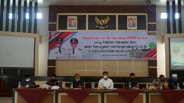 Spiritsumbar.com, Dharmasraya – Usai penetapan Peraturan Daerah (Perda) Provinsi Sumatera Barat tentang Adaptasi Kebiasaan Baru) AKB) dalam Pencegahan dan Pengendalian Corona Virus Disease 19 (covid-19), Pemerintah Kabupaten Dharmasraya langsung menggelar rapat koordinasi dengan segenap unsur Forkopimda dan Tim Gugus Tugas Percepatan Penanganan Covid-19, di Auditorium Kantor Bupati Dharmasraya, Selasa (15/9/2020).